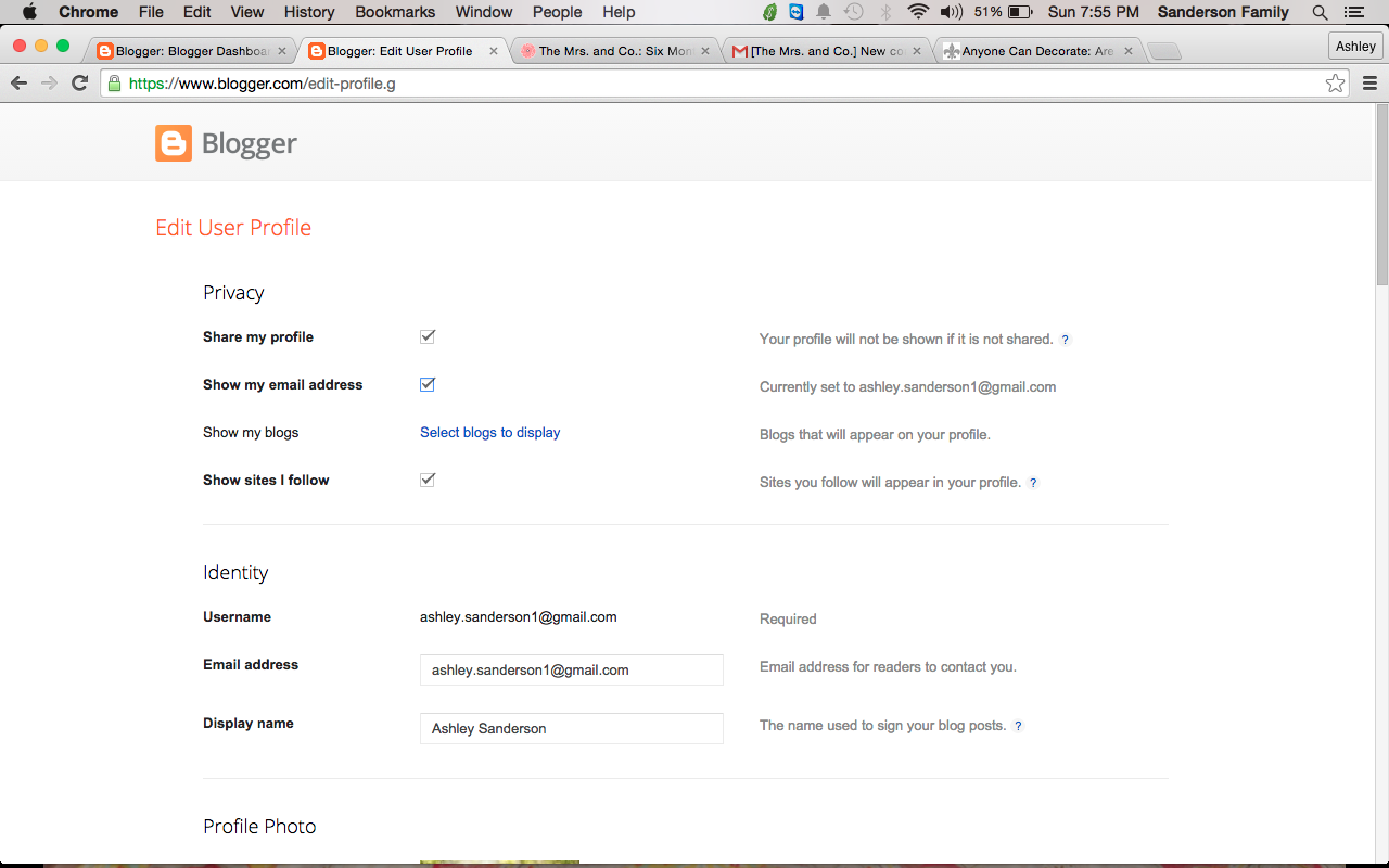 First, go to your blogger dashboard. In the top right hand corner you will see your name.